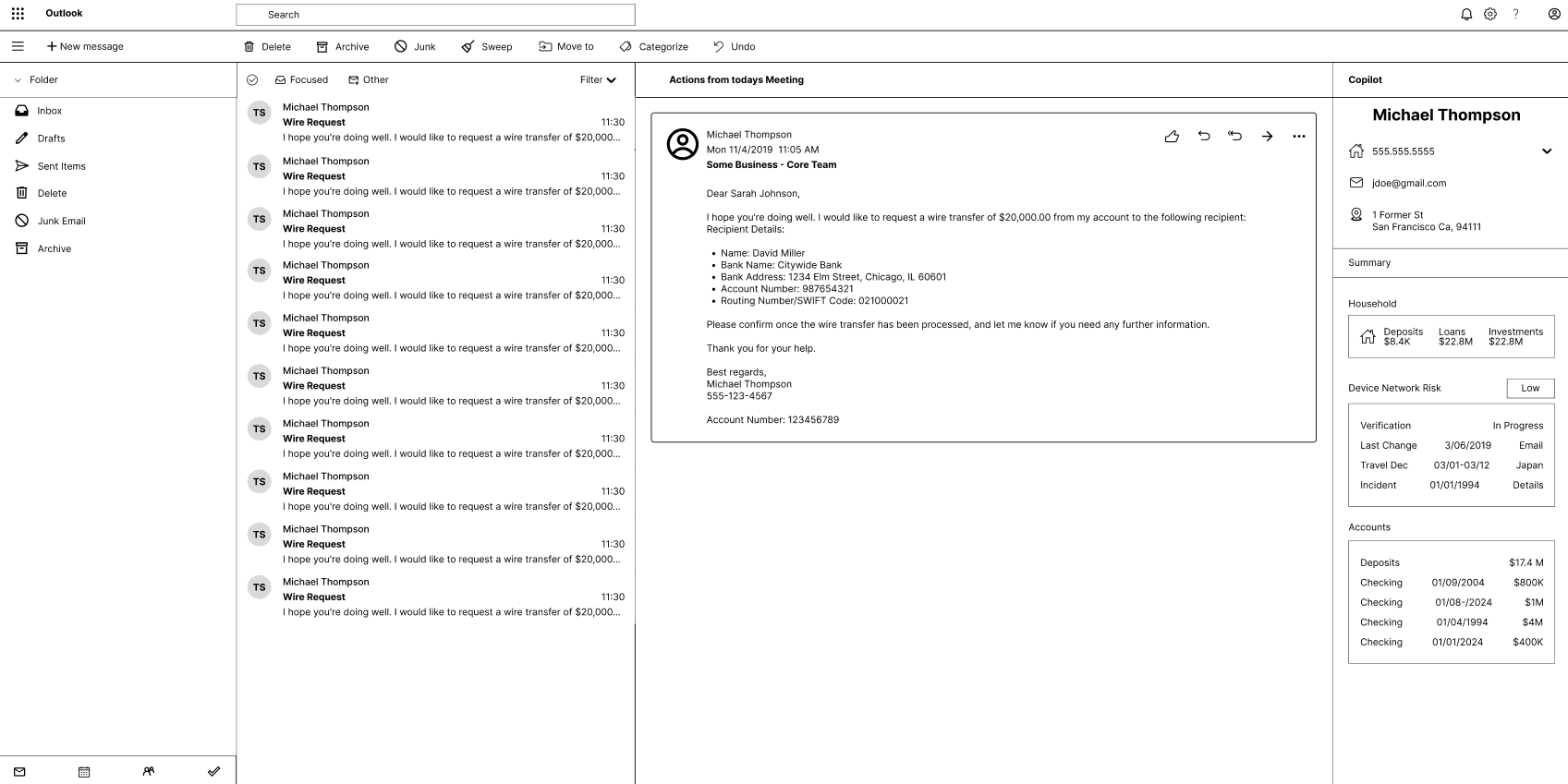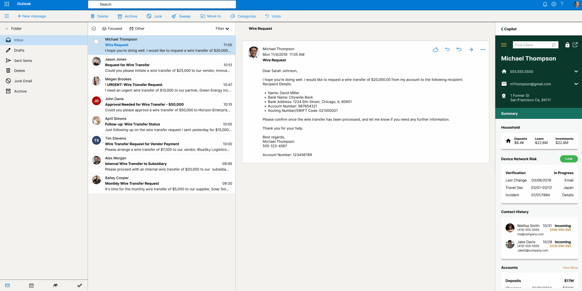 CoPilot is an Outlook extension that streamlines bankers’ workflows by embedding essential client data directly within Outlook. By consolidating contact details, account history, and verification info into a responsive widget, it eliminates app-switching during high-value wire transfers, reducing delays and human error.